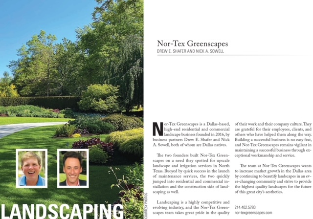 Nor-Tex Greenscapes was organized in 2013 after partners Nick Sowell & Drew Shafer saw an opportunity to build a business in Landscape Services using their combined passion for quality landscapes and experience in both residential and commercial real estate. Though the business started out as two guys pushing lawn mowers, the business has grown exponentially in its first few years. By assembling crews filled with high-quality people that care about their work, Nor-Tex has been able to exceed the quality that high-end residential and commercial clients demand. Our aim moving forward, is to further our focus on the installation and maintenance of high-end residential and commercial properties.